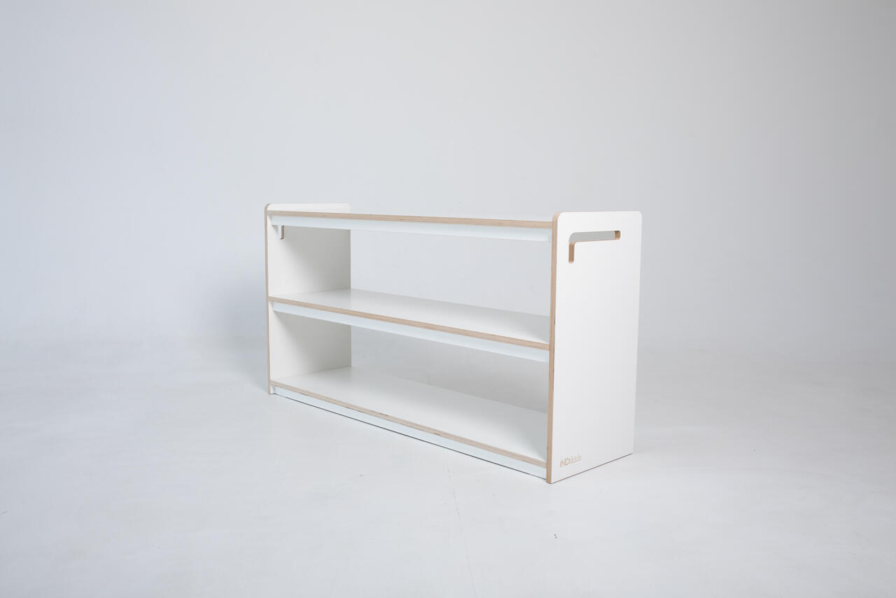Therefore, our low, three-level open shelves are best for storing toys and books.
